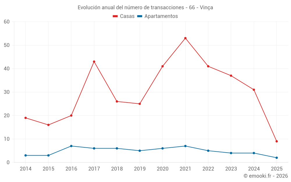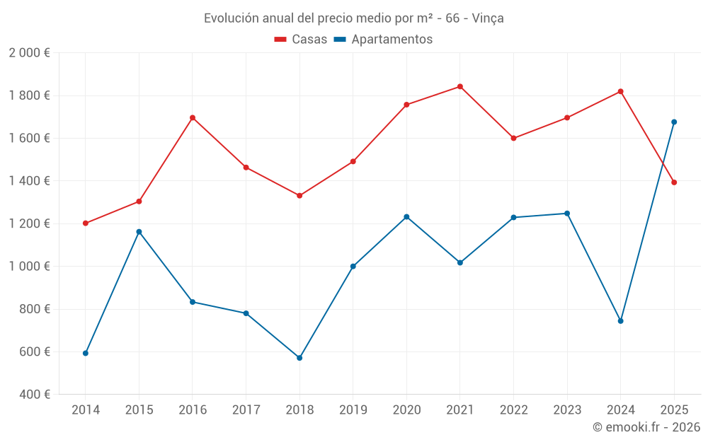 El precio mediano en las 27 transacciones de casas de los últimos 12 meses en la comuna de Vinça fue de 1 393 € por metro cuadrado para un valor patrimonial medio de 160 000 €. Durante este período el 60% de las transacciones estuvieron entre 810 y 2 659 € por metro cuadrado (del 2º al 8º decil).
