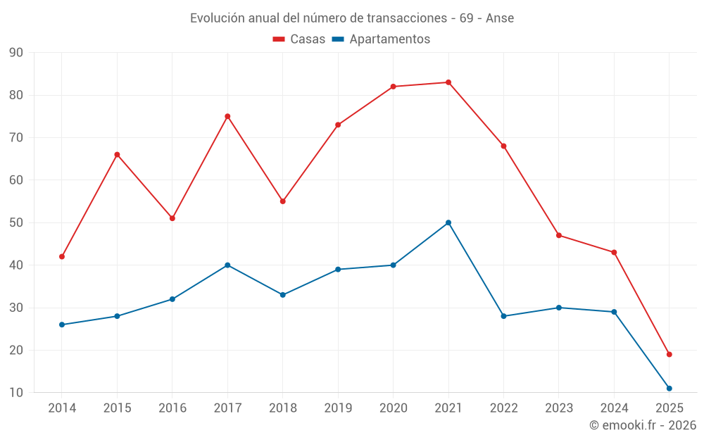 El precio mediano en las 19 transacciones de casas de los últimos 6 meses en la comuna de Anse fue de 3 412 € por metro cuadrado para un valor patrimonial medio de 340 000 €. Durante este período el 60% de las transacciones estuvieron entre 2 926 y 4 221 € por metro cuadrado (del 2º al 8º decil).