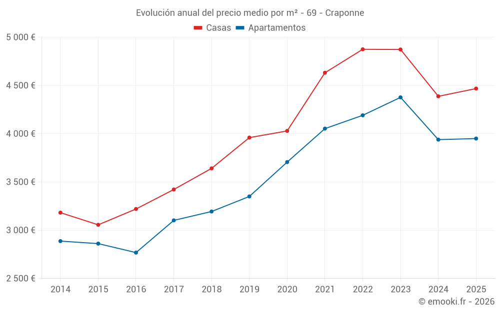 El precio mediano en las 25 transacciones de casas de los últimos 6 meses en la comuna de Craponne fue de 4 468 € por metro cuadrado para un valor patrimonial medio de 482 400 €. Durante este período el 60% de las transacciones estuvieron entre 3 921 y 5 203 € por metro cuadrado (del 2º al 8º decil).