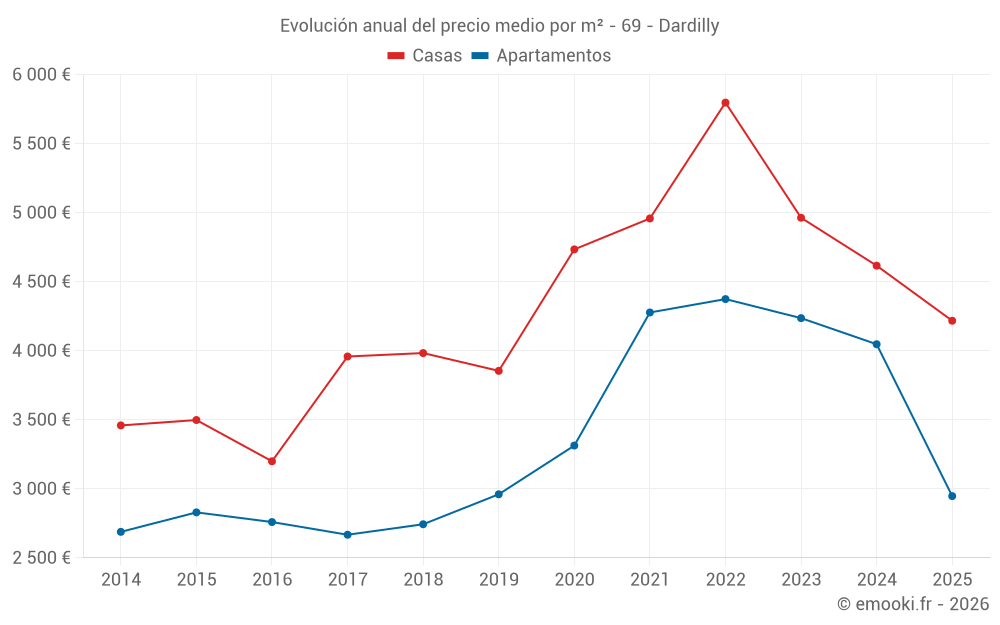 El precio mediano en las 25 transacciones de casas de los últimos 6 meses en la comuna de Dardilly fue de 4 217 € por metro cuadrado para un valor patrimonial medio de 575 200 €. Durante este período el 60% de las transacciones estuvieron entre 3 523 y 5 079 € por metro cuadrado (del 2º al 8º decil).