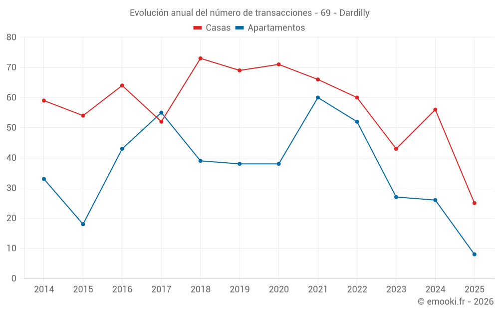 El precio mediano en las 21 transacciones de apartamentos de los últimos 12 meses en la comuna de Dardilly fue de 3 472 € por metro cuadrado para un valor patrimonial medio de 276 500 €. Durante este período el 60% de las transacciones estuvieron entre 2 645 y 4 457 € por metro cuadrado (del 2º al 8º decil).