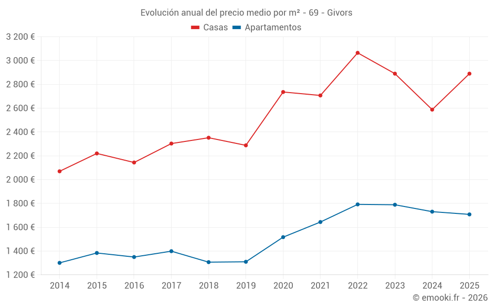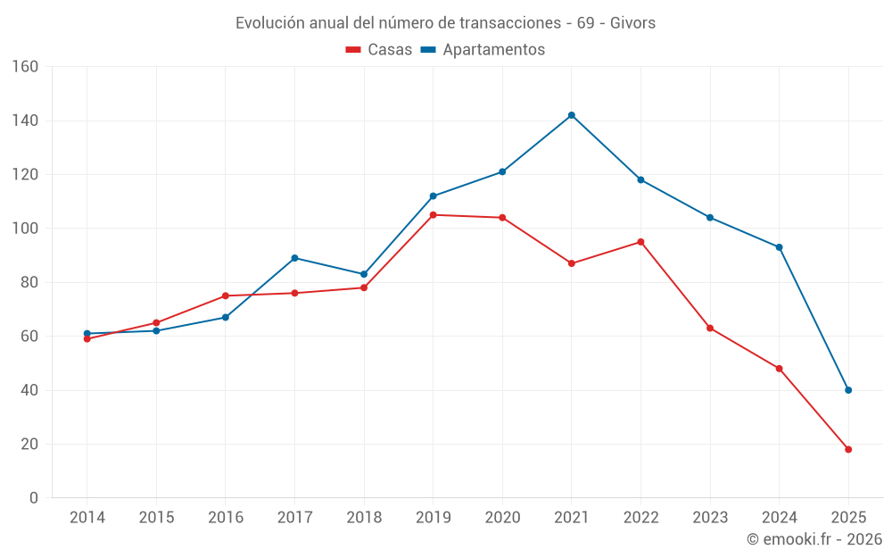 El precio mediano en las 21 transacciones de apartamentos de los últimos 3 meses en la comuna de Givors fue de 1 600 € por metro cuadrado para un valor patrimonial medio de 107 000 €. Durante este período el 60% de las transacciones estuvieron entre 1 372 y 1 972 € por metro cuadrado (del 2º al 8º decil).