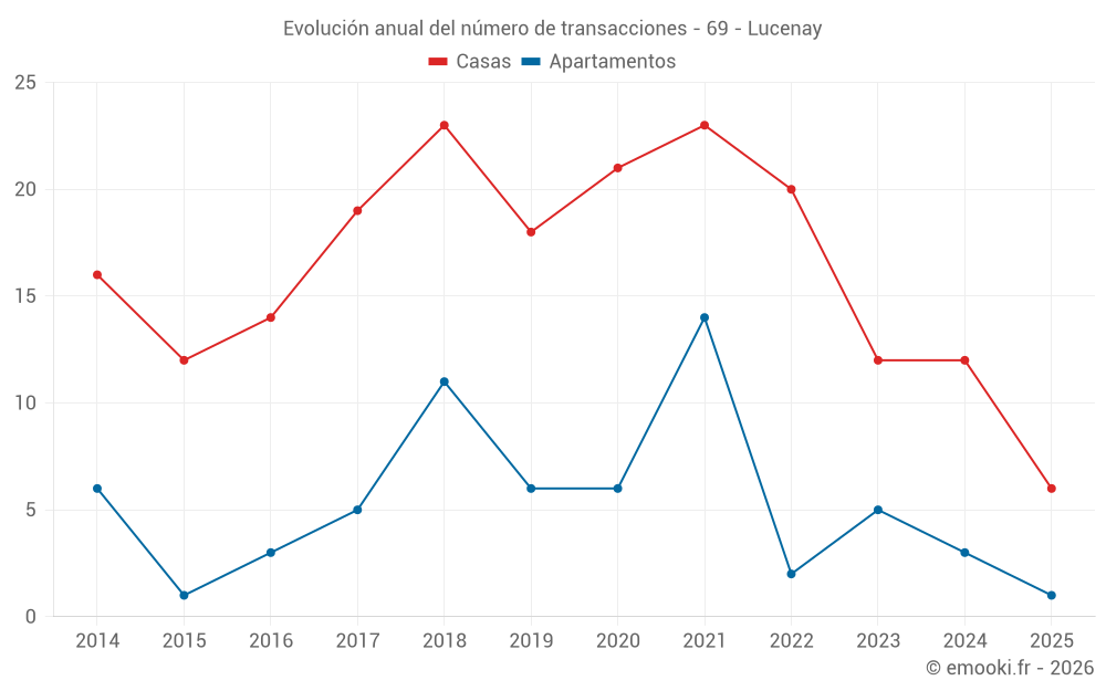 El precio mediano en las 25 transacciones de casas de los últimos 24 meses en la comuna de Lucenay fue de 3 583 € por metro cuadrado para un valor patrimonial medio de 369 000 €. Durante este período el 60% de las transacciones estuvieron entre 2 526 y 4 511 € por metro cuadrado (del 2º al 8º decil).