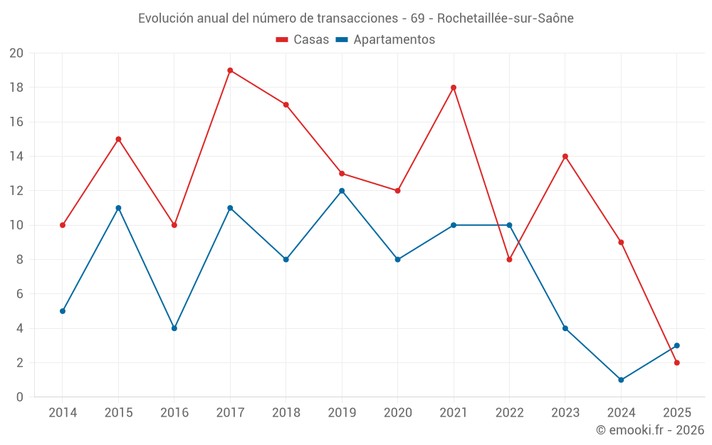 El precio mediano en las 15 transacciones de casas de los últimos 24 meses en la comuna de Rochetaillée-sur-Saône fue de 4 867 € por metro cuadrado para un valor patrimonial medio de 486 000 €. Durante este período el 60% de las transacciones estuvieron entre 2 522 y 6 245 € por metro cuadrado (del 2º al 8º decil).