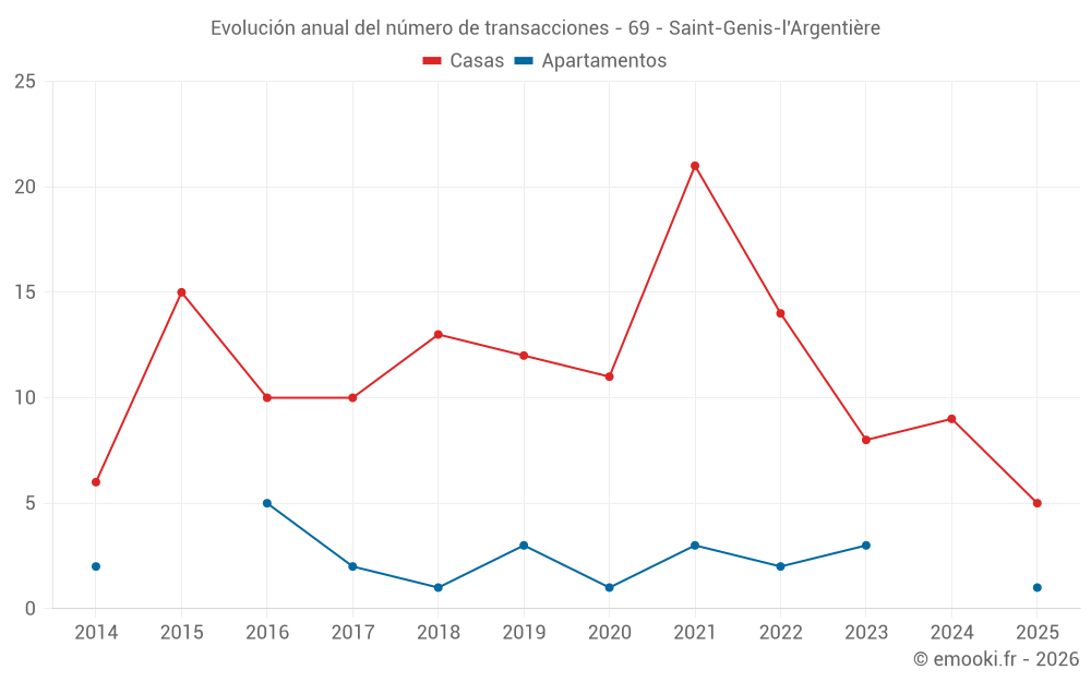 El precio mediano en las 21 transacciones de casas de los últimos 24 meses en la comuna de Saint-Genis-l'Argentière fue de 1 755 € por metro cuadrado para un valor patrimonial medio de 217 600 €. Durante este período el 60% de las transacciones estuvieron entre 1 267 y 3 005 € por metro cuadrado (del 2º al 8º decil).