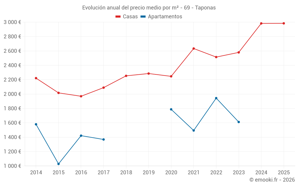 El precio mediano en las 16 transacciones de casas de los últimos 24 meses en la comuna de Taponas fue de 2 940 € por metro cuadrado para un valor patrimonial medio de 266 145 €. Durante este período el 60% de las transacciones estuvieron entre 2 250 y 3 438 € por metro cuadrado (del 2º al 8º decil).