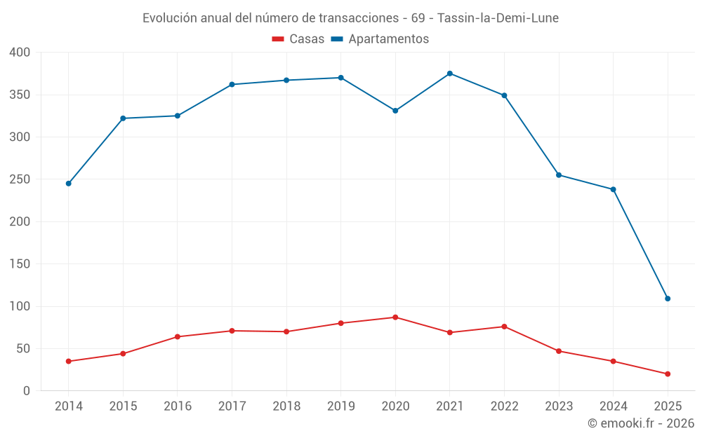 El precio mediano en las 41 transacciones de apartamentos de los últimos 3 meses en la comuna de Tassin-la-Demi-Lune fue de 3 846 € por metro cuadrado para un valor patrimonial medio de 250 000 €. Durante este período el 60% de las transacciones estuvieron entre 2 873 y 4 612 € por metro cuadrado (del 2º al 8º decil).