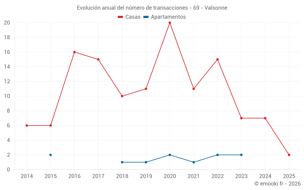 El precio mediano en las 14 transacciones de casas de los últimos 24 meses en la comuna de Valsonne fue de 1 998 € por metro cuadrado para un valor patrimonial medio de 198 500 €. Durante este período el 60% de las transacciones estuvieron entre 955 y 2 855 € por metro cuadrado (del 2º al 8º decil).