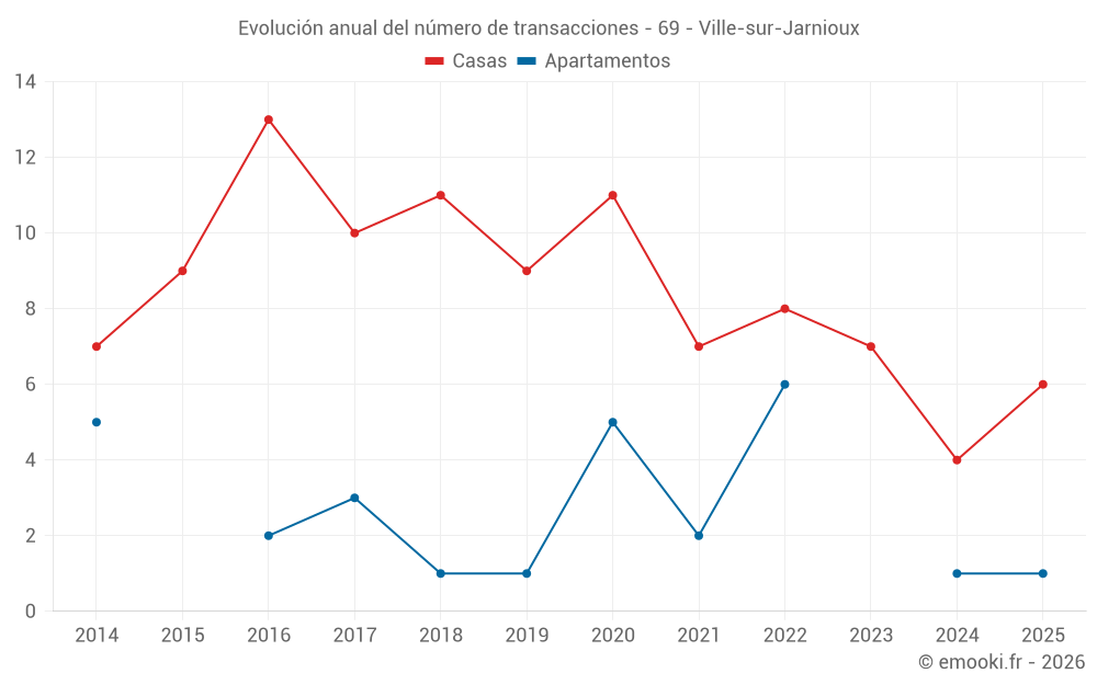 El precio mediano en las 14 transacciones de casas de los últimos 24 meses en la comuna de Ville-sur-Jarnioux fue de 2 242 € por metro cuadrado para un valor patrimonial medio de 297 500 €. Durante este período el 60% de las transacciones estuvieron entre 1 856 y 3 363 € por metro cuadrado (del 2º al 8º decil).