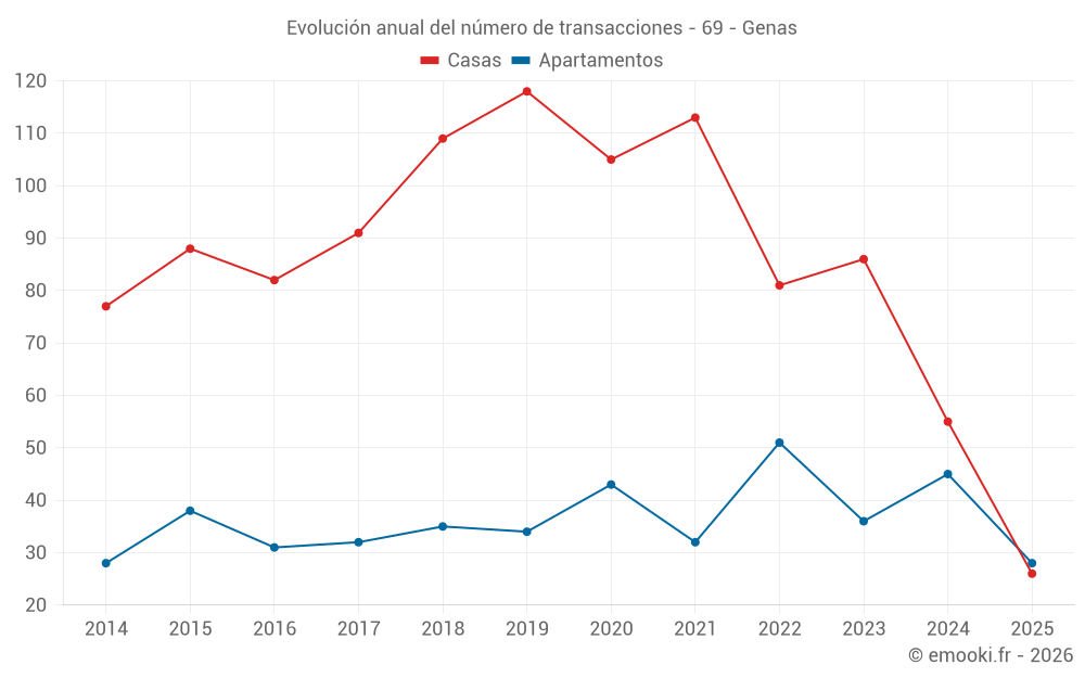 El precio mediano en las 28 transacciones de apartamentos de los últimos 6 meses en la comuna de Genas fue de 3 664 € por metro cuadrado para un valor patrimonial medio de 228 750 €. Durante este período el 60% de las transacciones estuvieron entre 3 119 y 4 966 € por metro cuadrado (del 2º al 8º decil).