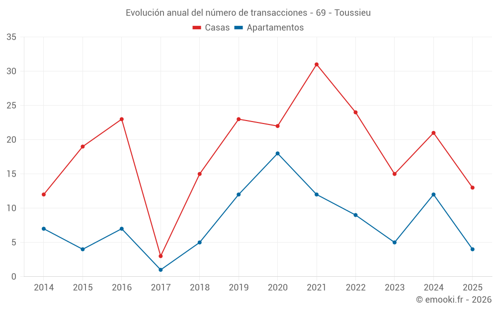 El precio mediano en las 23 transacciones de casas de los últimos 12 meses en la comuna de Toussieu fue de 3 813 € por metro cuadrado para un valor patrimonial medio de 340 000 €. Durante este período el 60% de las transacciones estuvieron entre 2 524 y 4 352 € por metro cuadrado (del 2º al 8º decil).