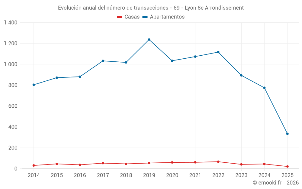 El precio mediano en las 127 transacciones de apartamentos de los últimos 3 meses en la comuna de Lyon 8e Arrondissement fue de 3 917 € por metro cuadrado para un valor patrimonial medio de 209 000 €. Durante este período el 60% de las transacciones estuvieron entre 2 934 y 5 097 € por metro cuadrado (del 2º al 8º decil).