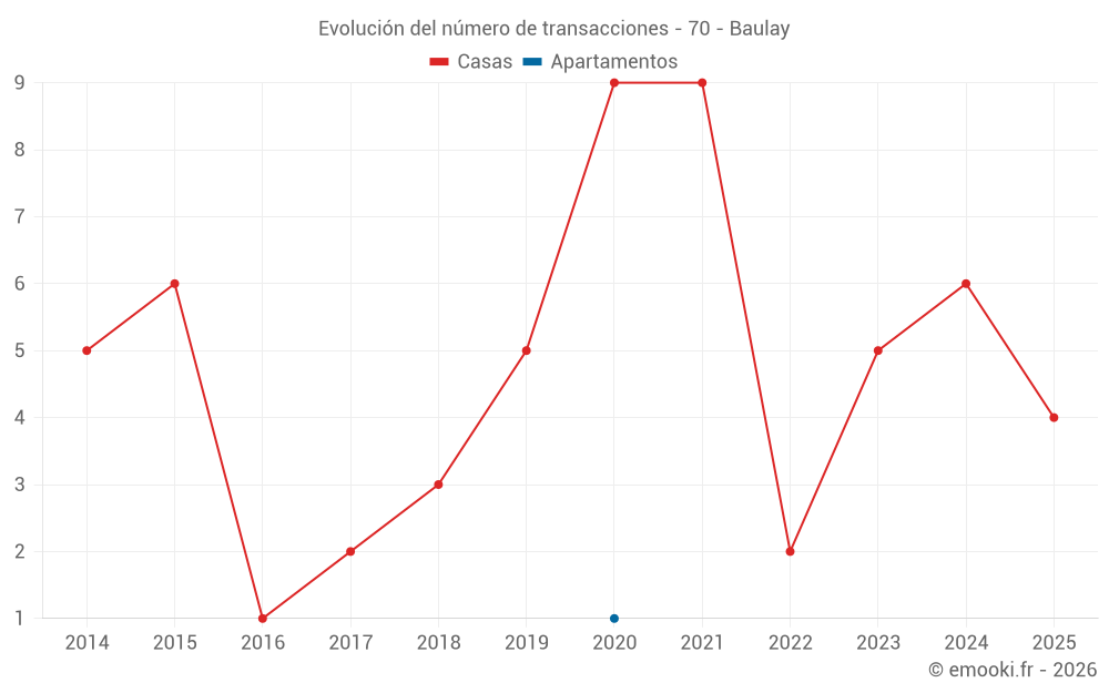 El precio mediano en las 14 transacciones de casas de los últimos 24 meses en la comuna de Baulay fue de 759 € por metro cuadrado para un valor patrimonial medio de 61 250 €. Durante este período el 60% de las transacciones estuvieron entre 425 y 1 085 € por metro cuadrado (del 2º al 8º decil).