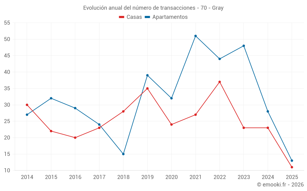 El precio mediano en las 27 transacciones de apartamentos de los últimos 12 meses en la comuna de Gray fue de 951 € por metro cuadrado para un valor patrimonial medio de 80 000 €. Durante este período el 60% de las transacciones estuvieron entre 562 y 1 201 € por metro cuadrado (del 2º al 8º decil).