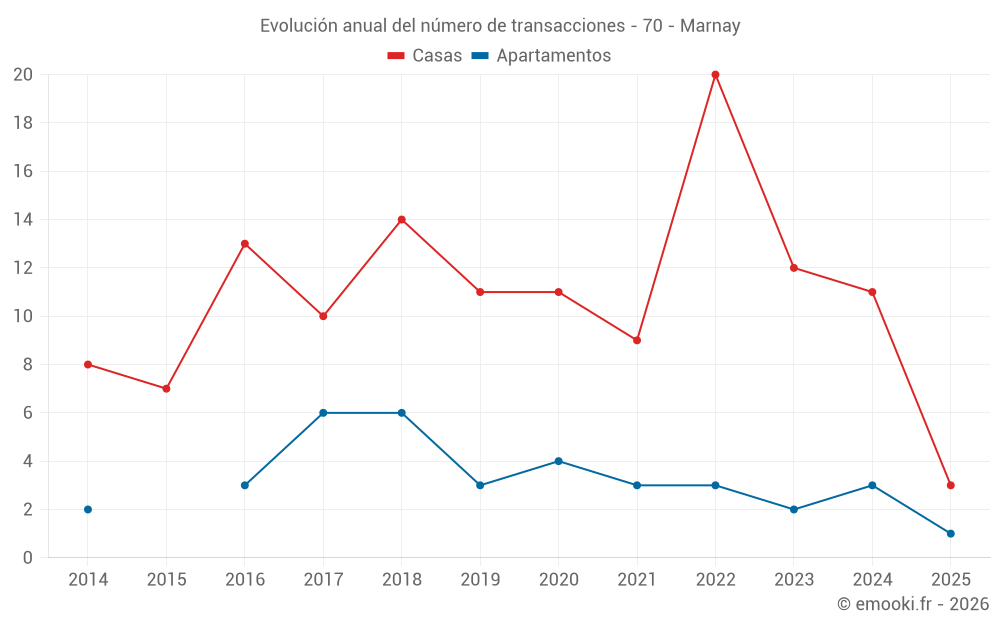 El precio mediano en las 20 transacciones de casas de los últimos 24 meses en la comuna de Marnay fue de 1 806 € por metro cuadrado para un valor patrimonial medio de 188 225 €. Durante este período el 60% de las transacciones estuvieron entre 1 250 y 2 399 € por metro cuadrado (del 2º al 8º decil).