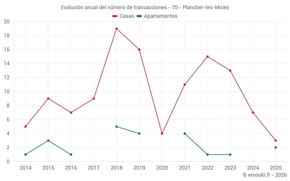 El precio mediano en las 16 transacciones de casas de los últimos 24 meses en la comuna de Plancher-les-Mines fue de 1 196 € por metro cuadrado para un valor patrimonial medio de 95 388 €. Durante este período el 60% de las transacciones estuvieron entre 909 y 1 731 € por metro cuadrado (del 2º al 8º decil).