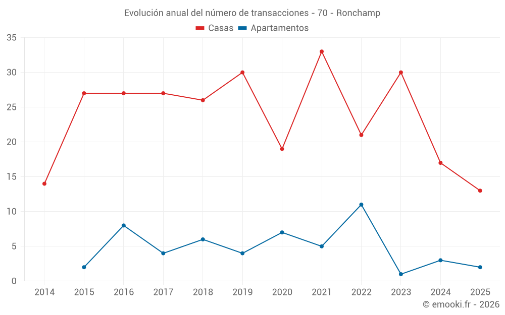 El precio mediano en las 20 transacciones de casas de los últimos 12 meses en la comuna de Ronchamp fue de 1 148 € por metro cuadrado para un valor patrimonial medio de 117 850 €. Durante este período el 60% de las transacciones estuvieron entre 896 y 1 414 € por metro cuadrado (del 2º al 8º decil).