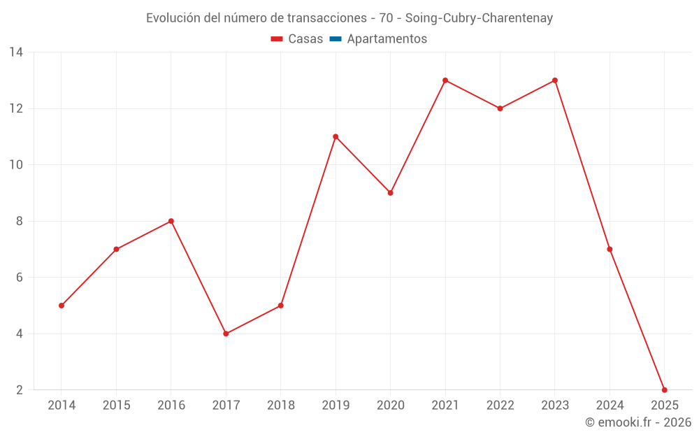 El precio mediano en las 17 transacciones de casas de los últimos 24 meses en la comuna de Soing-Cubry-Charentenay fue de 673 € por metro cuadrado para un valor patrimonial medio de 69 000 €. Durante este período el 60% de las transacciones estuvieron entre 344 y 1 446 € por metro cuadrado (del 2º al 8º decil).