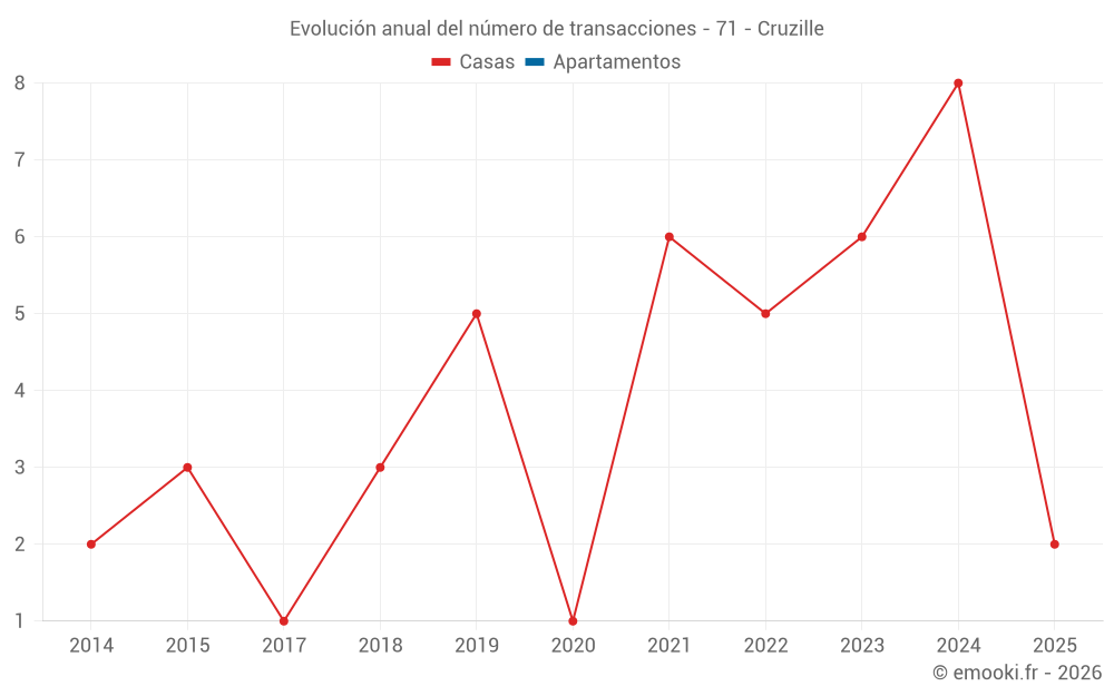 El precio mediano en las 15 transacciones de casas de los últimos 24 meses en la comuna de Cruzille fue de 1 429 € por metro cuadrado para un valor patrimonial medio de 150 000 €. Durante este período el 60% de las transacciones estuvieron entre 877 y 2 263 € por metro cuadrado (del 2º al 8º decil).