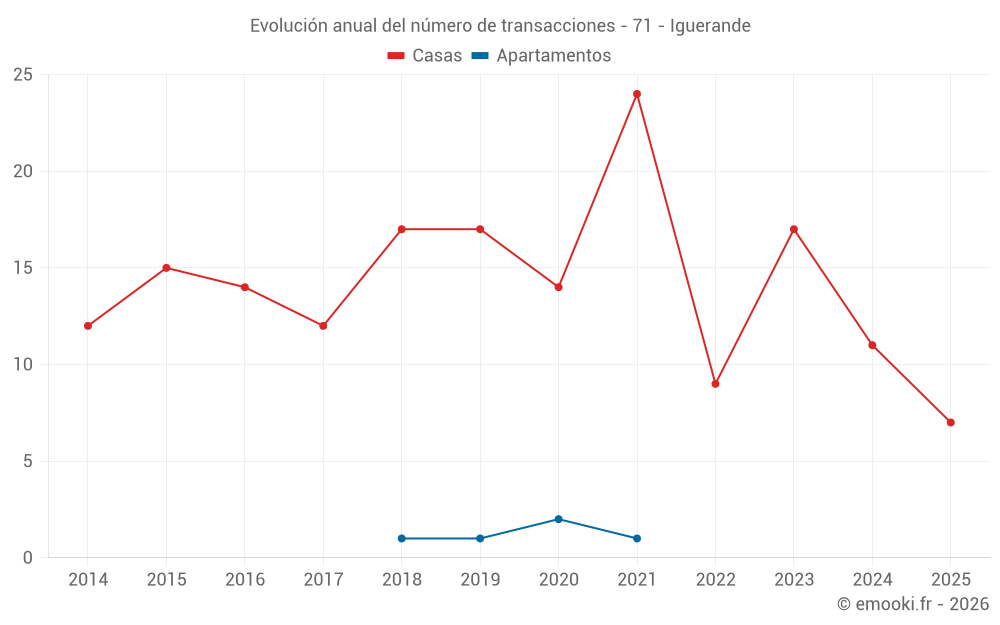 El precio mediano en las 32 transacciones de casas de los últimos 24 meses en la comuna de Iguerande fue de 1 472 € por metro cuadrado para un valor patrimonial medio de 135 300 €. Durante este período el 60% de las transacciones estuvieron entre 789 y 1 977 € por metro cuadrado (del 2º al 8º decil).