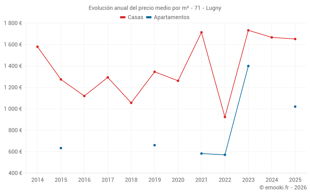 El precio mediano en las 20 transacciones de casas de los últimos 24 meses en la comuna de Lugny fue de 1 667 € por metro cuadrado para un valor patrimonial medio de 168 500 €. Durante este período el 60% de las transacciones estuvieron entre 1 060 y 1 794 € por metro cuadrado (del 2º al 8º decil).