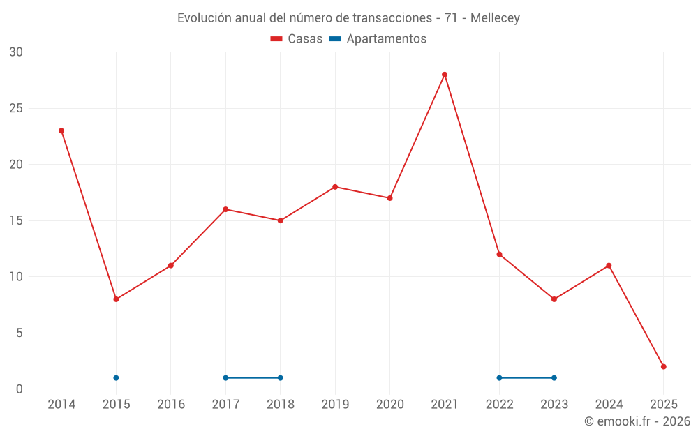 El precio mediano en las 19 transacciones de casas de los últimos 24 meses en la comuna de Mellecey fue de 1 911 € por metro cuadrado para un valor patrimonial medio de 289 500 €. Durante este período el 60% de las transacciones estuvieron entre 1 632 y 2 522 € por metro cuadrado (del 2º al 8º decil).