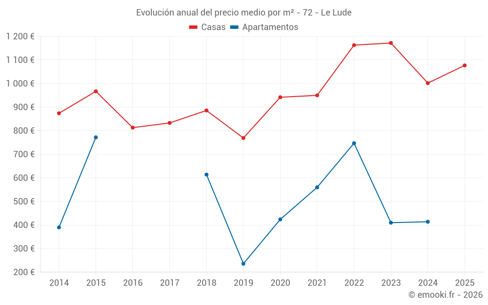 El precio mediano en las 21 transacciones de casas de los últimos 6 meses en la comuna de Le Lude fue de 1 077 € por metro cuadrado para un valor patrimonial medio de 87 000 €. Durante este período el 60% de las transacciones estuvieron entre 667 y 1 286 € por metro cuadrado (del 2º al 8º decil).