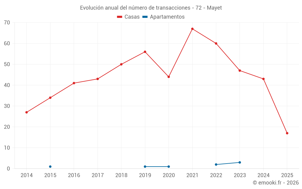 El precio mediano en las 42 transacciones de casas de los últimos 12 meses en la comuna de Mayet fue de 1 187 € por metro cuadrado para un valor patrimonial medio de 114 500 €. Durante este período el 60% de las transacciones estuvieron entre 912 y 1 722 € por metro cuadrado (del 2º al 8º decil).