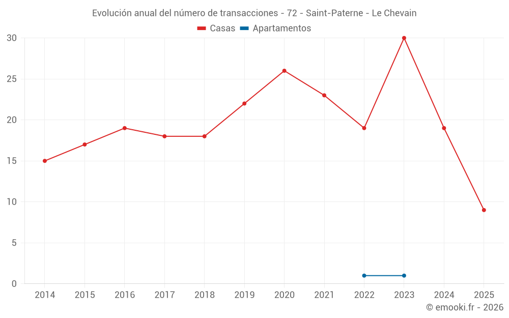 El precio mediano en las 20 transacciones de casas de los últimos 12 meses en la comuna de Saint-Paterne - Le Chevain fue de 1 722 € por metro cuadrado para un valor patrimonial medio de 178 500 €. Durante este período el 60% de las transacciones estuvieron entre 1 444 y 1 969 € por metro cuadrado (del 2º al 8º decil).