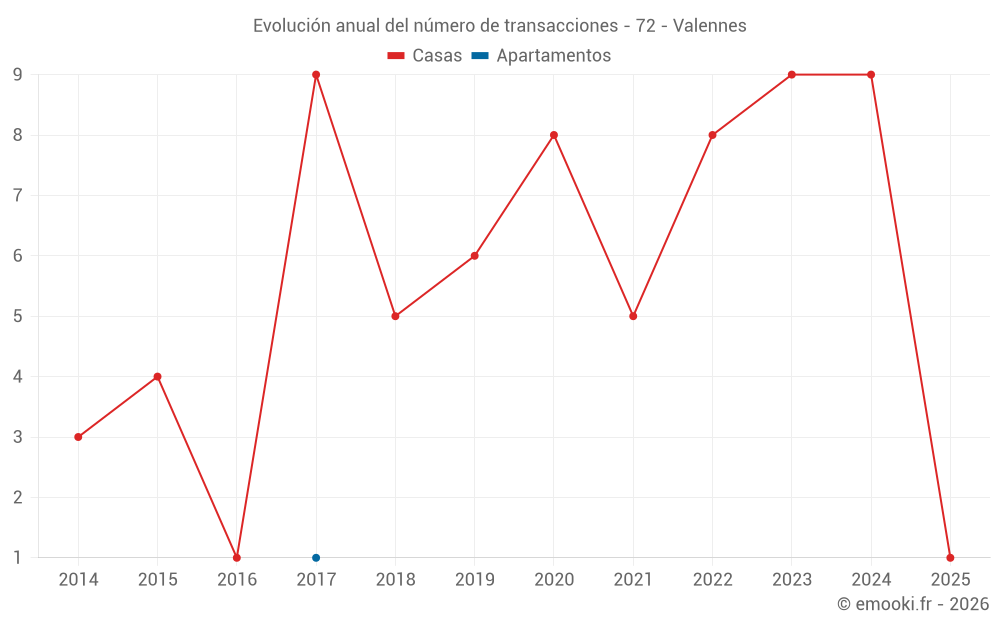 El precio mediano en las 16 transacciones de casas de los últimos 24 meses en la comuna de Valennes fue de 1 268 € por metro cuadrado para un valor patrimonial medio de 81 000 €. Durante este período el 60% de las transacciones estuvieron entre 587 y 2 044 € por metro cuadrado (del 2º al 8º decil).