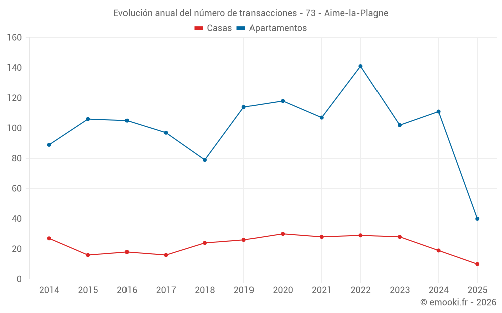 El precio mediano en las 27 transacciones de apartamentos de los últimos 3 meses en la comuna de Aime-la-Plagne fue de 4 987 € por metro cuadrado para un valor patrimonial medio de 146 050 €. Durante este período el 60% de las transacciones estuvieron entre 4 133 y 5 614 € por metro cuadrado (del 2º al 8º decil).