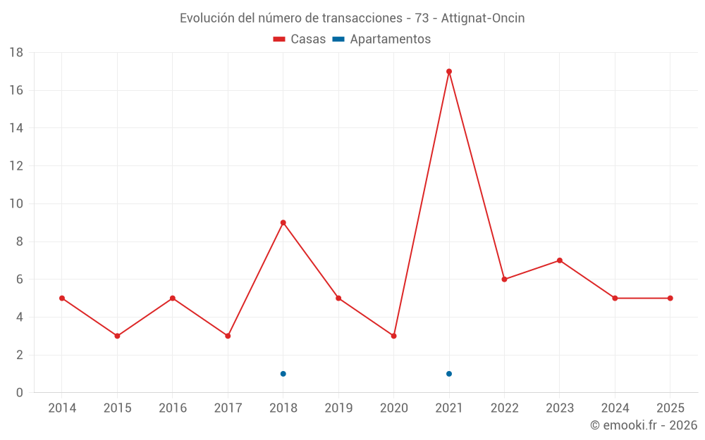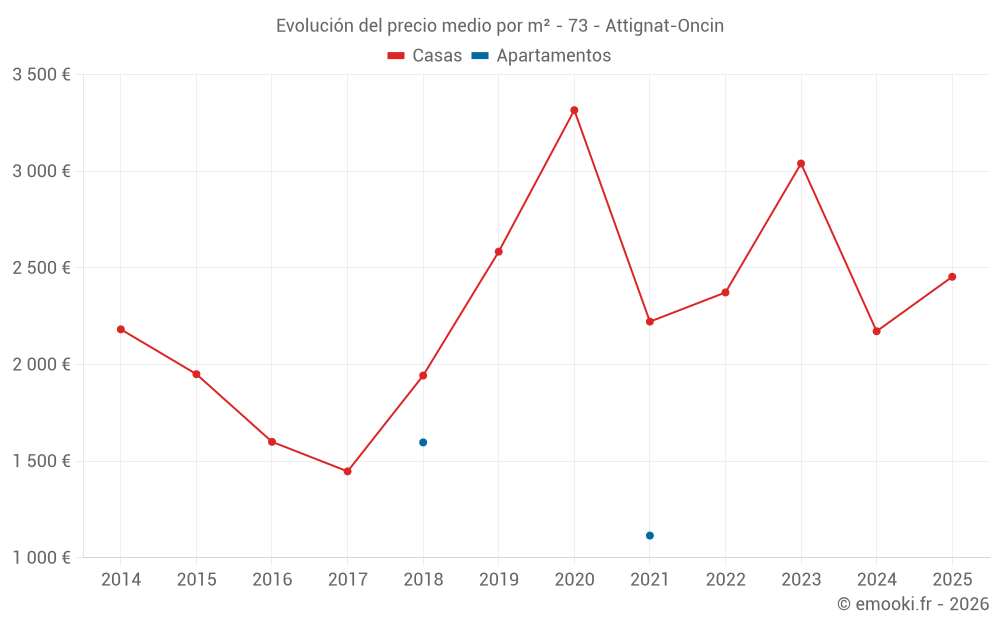 El precio mediano en las 14 transacciones de casas de los últimos 24 meses en la comuna de Attignat-Oncin fue de 2 313 € por metro cuadrado para un valor patrimonial medio de 295 125 €. Durante este período el 60% de las transacciones estuvieron entre 1 536 y 3 061 € por metro cuadrado (del 2º al 8º decil).