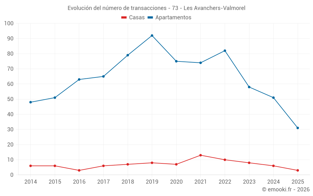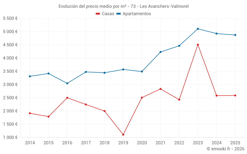 El precio mediano en las 21 transacciones de apartamentos de los últimos 3 meses en la comuna de Les Avanchers-Valmorel fue de 4 984 € por metro cuadrado para un valor patrimonial medio de 130 000 €. Durante este período el 60% de las transacciones estuvieron entre 4 416 y 6 125 € por metro cuadrado (del 2º al 8º decil).