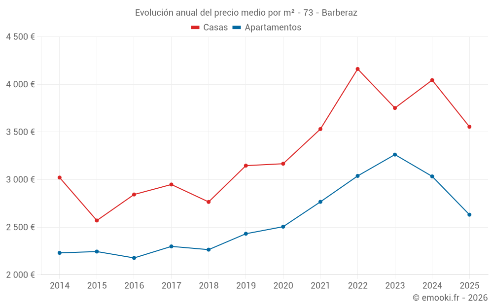 El precio mediano en las 39 transacciones de apartamentos de los últimos 12 meses en la comuna de Barberaz fue de 2 967 € por metro cuadrado para un valor patrimonial medio de 197 000 €. Durante este período el 60% de las transacciones estuvieron entre 2 435 y 3 728 € por metro cuadrado (del 2º al 8º decil).