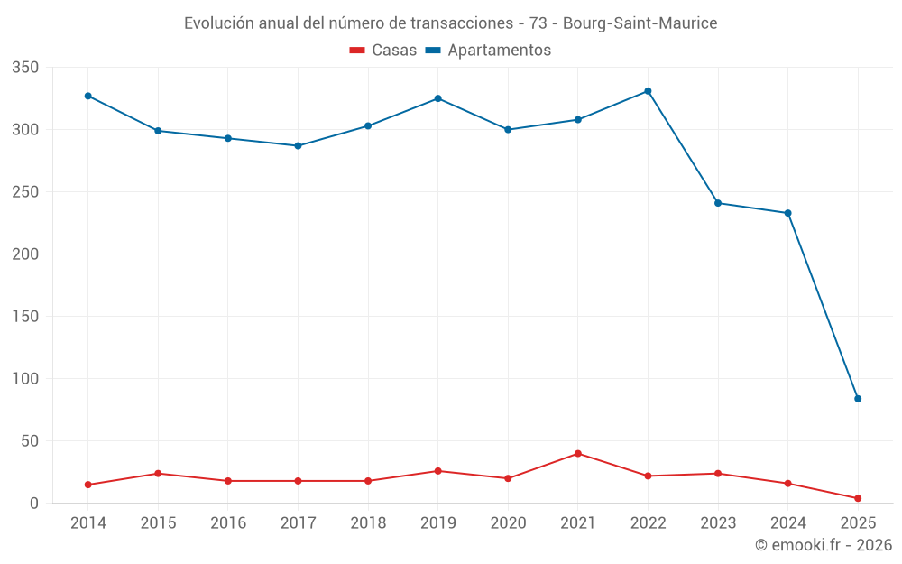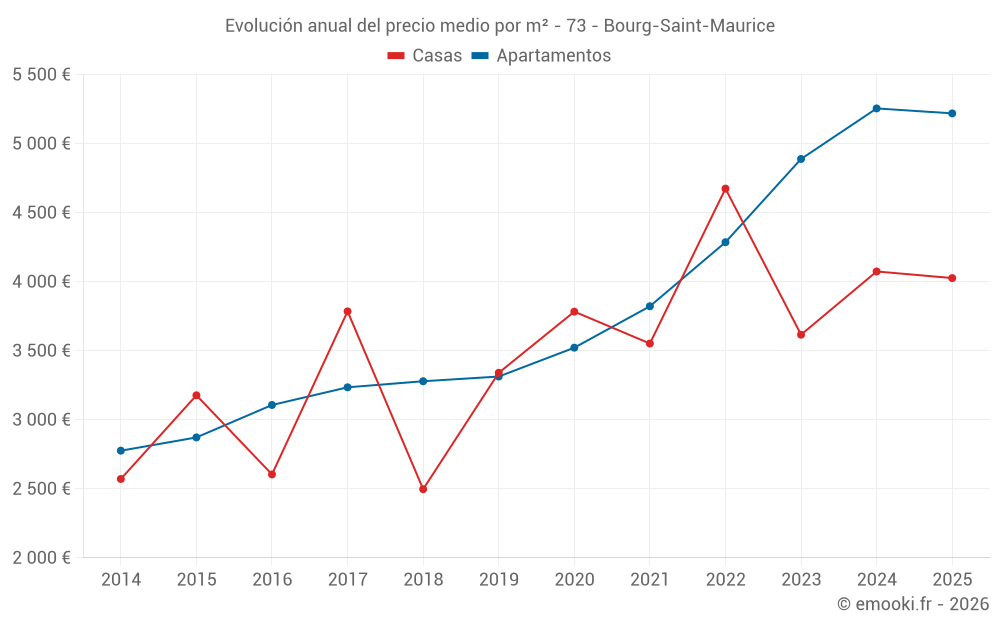 El precio mediano en las 45 transacciones de apartamentos de los últimos 3 meses en la comuna de Bourg-Saint-Maurice fue de 5 271 € por metro cuadrado para un valor patrimonial medio de 209 300 €. Durante este período el 60% de las transacciones estuvieron entre 3 774 y 7 635 € por metro cuadrado (del 2º al 8º decil).