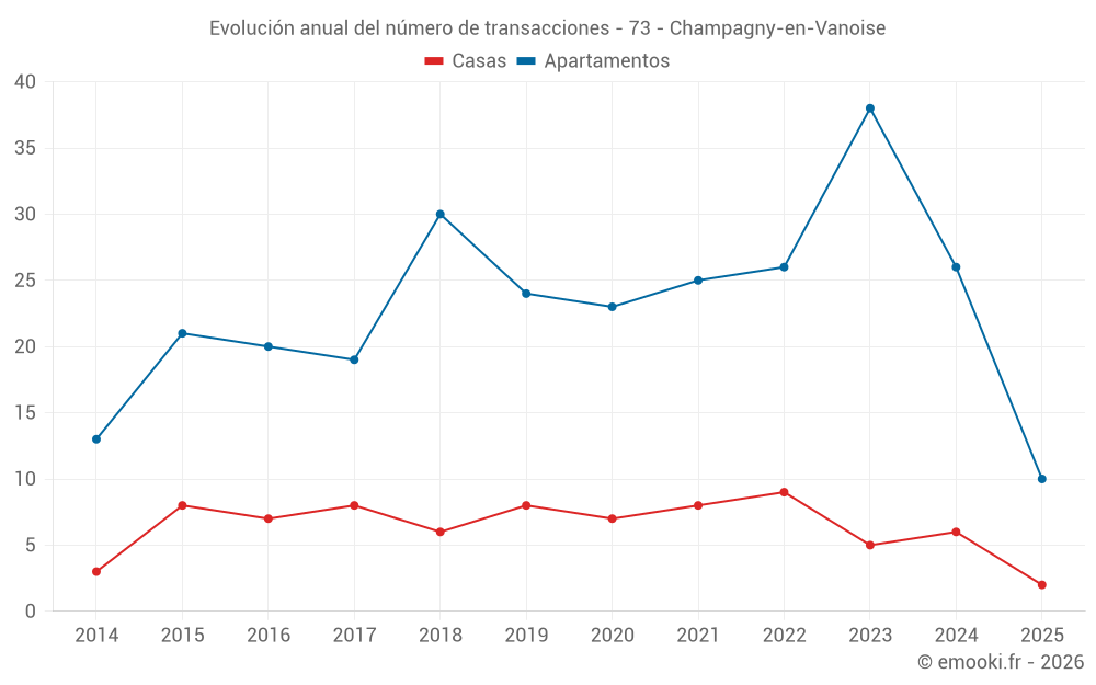 El precio mediano en las 21 transacciones de apartamentos de los últimos 12 meses en la comuna de Champagny-en-Vanoise fue de 5 160 € por metro cuadrado para un valor patrimonial medio de 302 800 €. Durante este período el 60% de las transacciones estuvieron entre 4 291 y 6 070 € por metro cuadrado (del 2º al 8º decil).