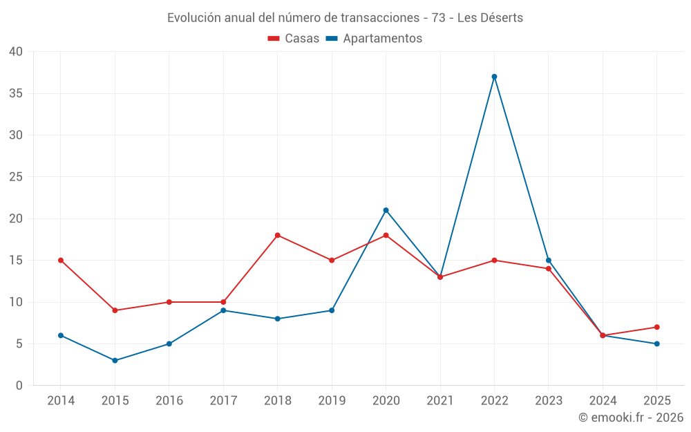 El precio mediano en las 18 transacciones de apartamentos de los últimos 24 meses en la comuna de Les Déserts fue de 4 538 € por metro cuadrado para un valor patrimonial medio de 182 625 €. Durante este período el 60% de las transacciones estuvieron entre 3 537 y 5 548 € por metro cuadrado (del 2º al 8º decil).