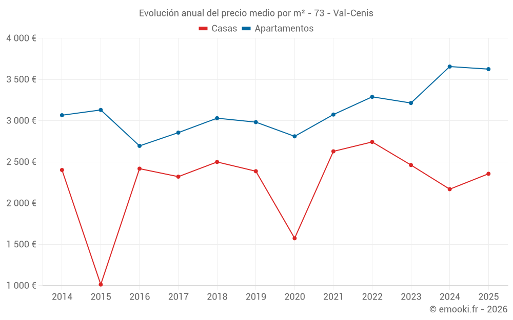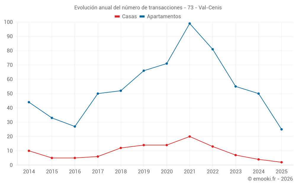 El precio mediano en las 25 transacciones de apartamentos de los últimos 6 meses en la comuna de Val-Cenis fue de 3 625 € por metro cuadrado para un valor patrimonial medio de 121 000 €. Durante este período el 60% de las transacciones estuvieron entre 2 352 y 4 522 € por metro cuadrado (del 2º al 8º decil).