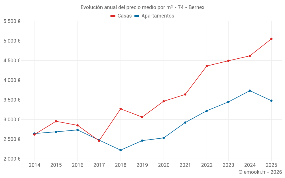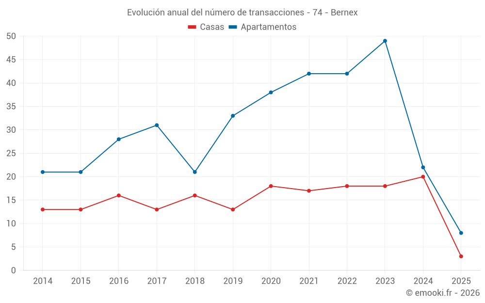 El precio mediano en las 31 transacciones de casas de los últimos 24 meses en la comuna de Bernex fue de 4 608 € por metro cuadrado para un valor patrimonial medio de 430 000 €. Durante este período el 60% de las transacciones estuvieron entre 3 487 y 5 429 € por metro cuadrado (del 2º al 8º decil).