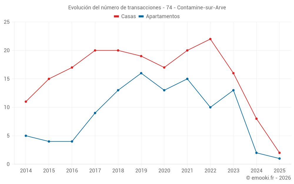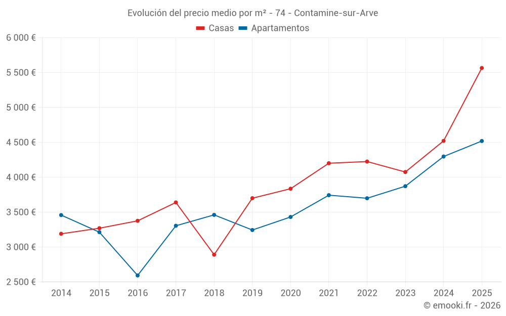 El precio mediano en las 15 transacciones de casas de los últimos 24 meses en la comuna de Contamine-sur-Arve fue de 4 494 € por metro cuadrado para un valor patrimonial medio de 435 393 €. Durante este período el 60% de las transacciones estuvieron entre 3 446 y 5 481 € por metro cuadrado (del 2º al 8º decil).