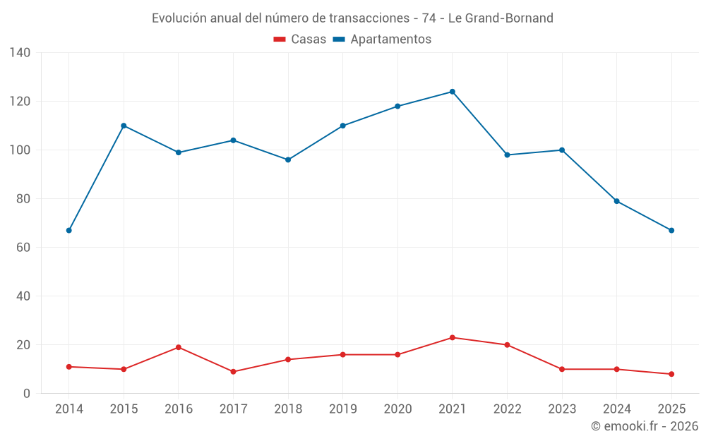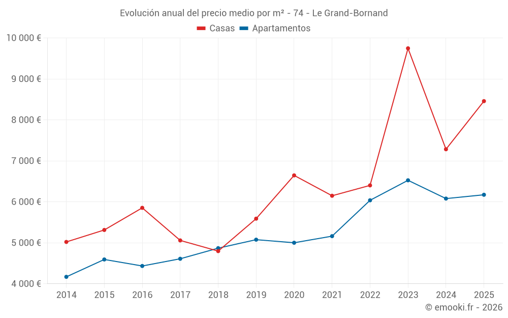 El precio mediano en las 30 transacciones de apartamentos de los últimos 3 meses en la comuna de Le Grand-Bornand fue de 6 792 € por metro cuadrado para un valor patrimonial medio de 267 200 €. Durante este período el 60% de las transacciones estuvieron entre 4 999 y 7 478 € por metro cuadrado (del 2º al 8º decil).