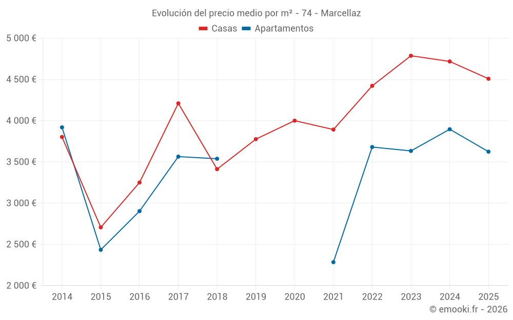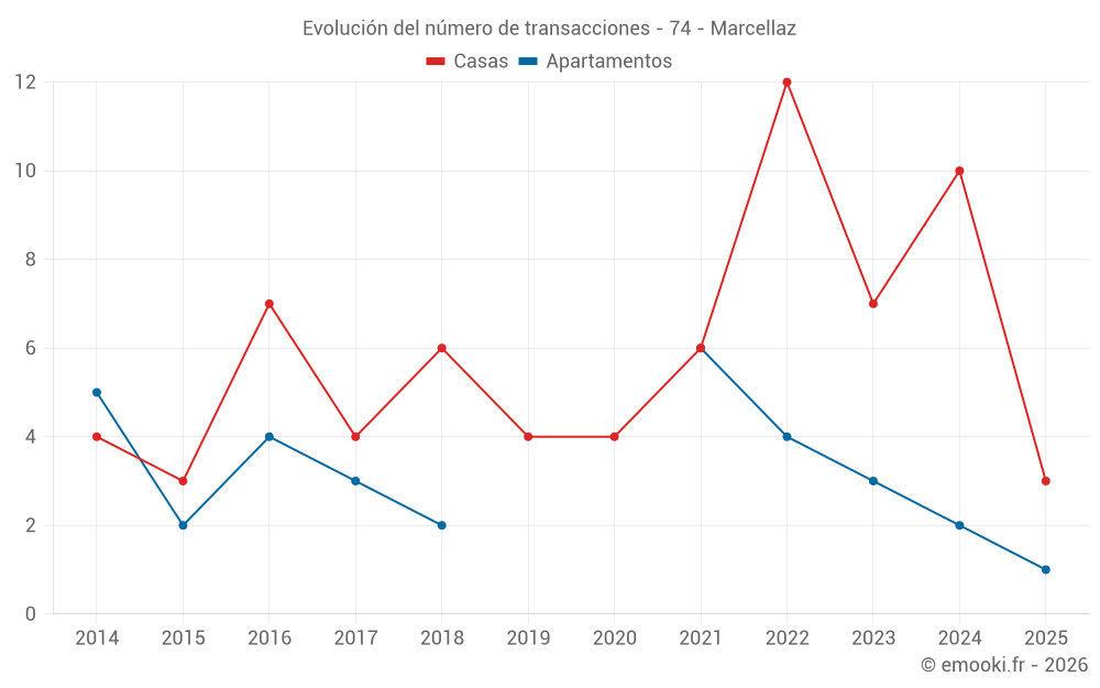 El precio mediano en las 17 transacciones de casas de los últimos 24 meses en la comuna de Marcellaz fue de 4 938 € por metro cuadrado para un valor patrimonial medio de 512 900 €. Durante este período el 60% de las transacciones estuvieron entre 3 631 y 5 546 € por metro cuadrado (del 2º al 8º decil).