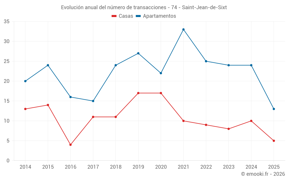 El precio mediano en las 19 transacciones de casas de los últimos 24 meses en la comuna de Saint-Jean-de-Sixt fue de 6 326 € por metro cuadrado para un valor patrimonial medio de 630 000 €. Durante este período el 60% de las transacciones estuvieron entre 4 676 y 8 494 € por metro cuadrado (del 2º al 8º decil).
