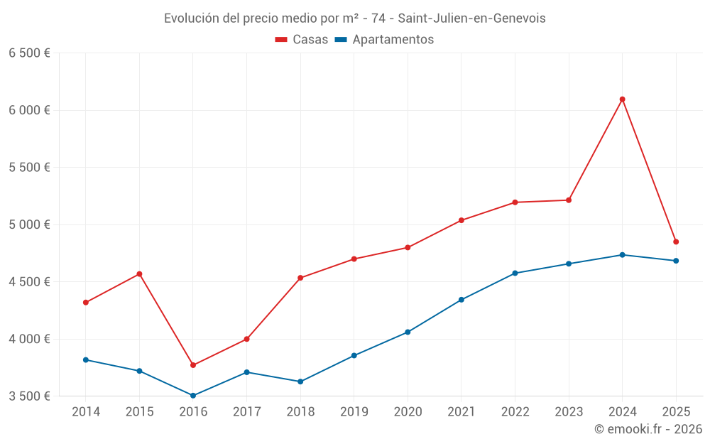 El precio mediano en las 21 transacciones de apartamentos de los últimos 3 meses en la comuna de Saint-Julien-en-Genevois fue de 4 782 € por metro cuadrado para un valor patrimonial medio de 270 000 €. Durante este período el 60% de las transacciones estuvieron entre 4 117 y 5 456 € por metro cuadrado (del 2º al 8º decil).