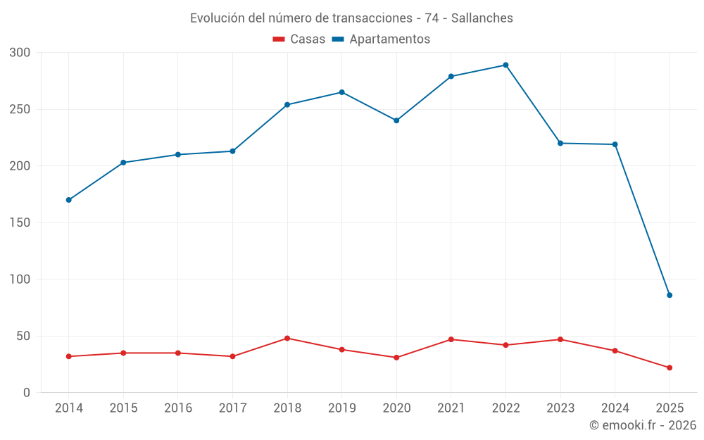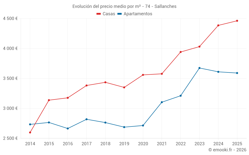 El precio mediano en las 22 transacciones de casas de los últimos 6 meses en la comuna de Sallanches fue de 4 462 € por metro cuadrado para un valor patrimonial medio de 456 000 €. Durante este período el 60% de las transacciones estuvieron entre 3 721 y 4 962 € por metro cuadrado (del 2º al 8º decil).