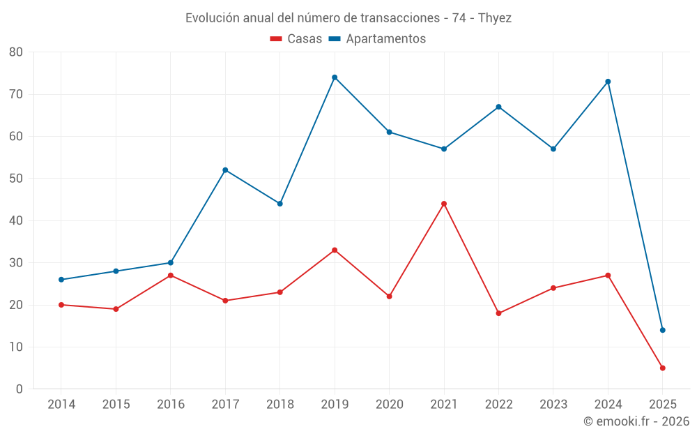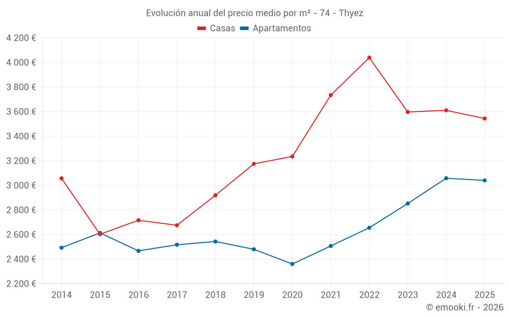 El precio mediano en las 52 transacciones de apartamentos de los últimos 12 meses en la comuna de Thyez fue de 3 053 € por metro cuadrado para un valor patrimonial medio de 164 750 €. Durante este período el 60% de las transacciones estuvieron entre 2 685 y 3 627 € por metro cuadrado (del 2º al 8º decil).