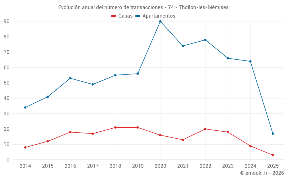 El precio mediano en las 47 transacciones de apartamentos de los últimos 12 meses en la comuna de Thollon-les-Mémises fue de 3 502 € por metro cuadrado para un valor patrimonial medio de 107 000 €. Durante este período el 60% de las transacciones estuvieron entre 3 088 y 4 125 € por metro cuadrado (del 2º al 8º decil).