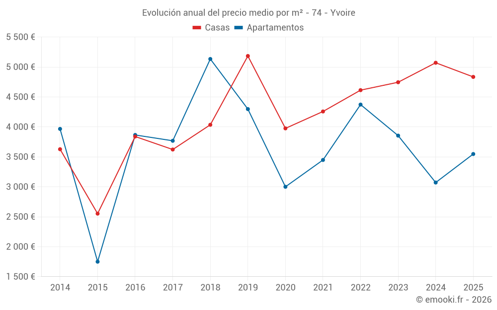 El precio mediano en las 18 transacciones de casas de los últimos 24 meses en la comuna de Yvoire fue de 4 818 € por metro cuadrado para un valor patrimonial medio de 582 500 €. Durante este período el 60% de las transacciones estuvieron entre 3 509 y 7 760 € por metro cuadrado (del 2º al 8º decil).