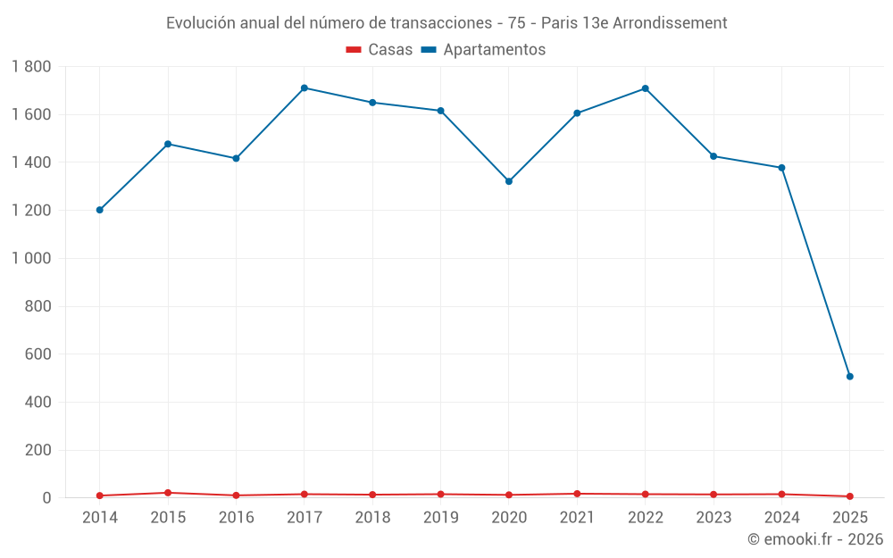 El precio mediano en las 121 transacciones de apartamentos de los últimos 3 meses en la comuna de Paris 13e Arrondissement fue de 8 688 € por metro cuadrado para un valor patrimonial medio de 308 870 €. Durante este período el 60% de las transacciones estuvieron entre 6 961 y 10 425 € por metro cuadrado (del 2º al 8º decil).