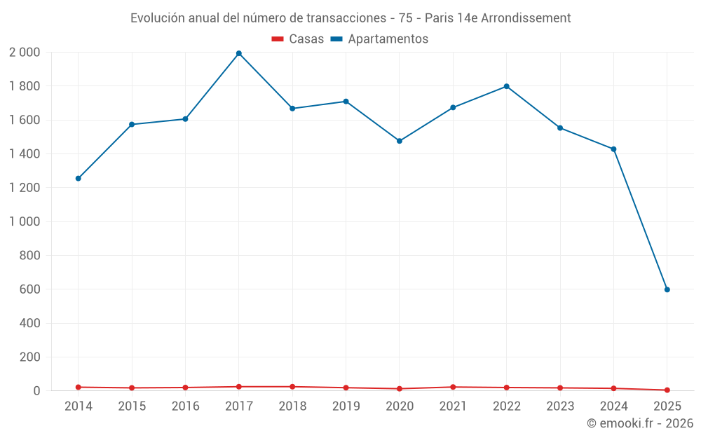 El precio mediano en las 33 transacciones de casas de los últimos 24 meses en la comuna de Paris 14e Arrondissement fue de 11 593 € por metro cuadrado para un valor patrimonial medio de 1 508 000 €. Durante este período el 60% de las transacciones estuvieron entre 9 559 y 19 454 € por metro cuadrado (del 2º al 8º decil).